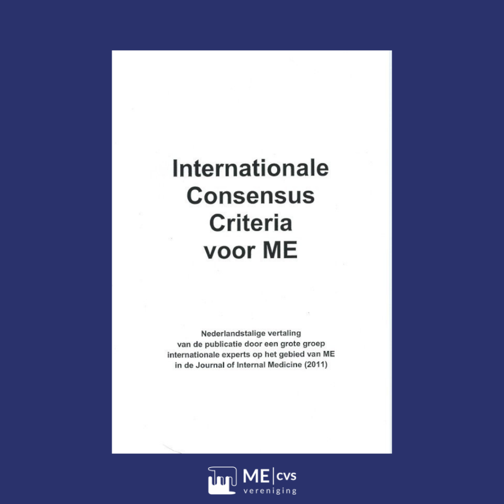 De officiële Nederlandse uitgave van de International Consensus Criteria (ICC) uit 2011. Dit zijn diagnose criteria voor ME, ontwikkeld door een groep van 25 experts uit 13 verschillende landen. Je kunt de ICC gebruiken als ruggensteun bij je gesprekken met artsen en behandelaars.